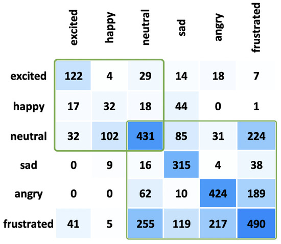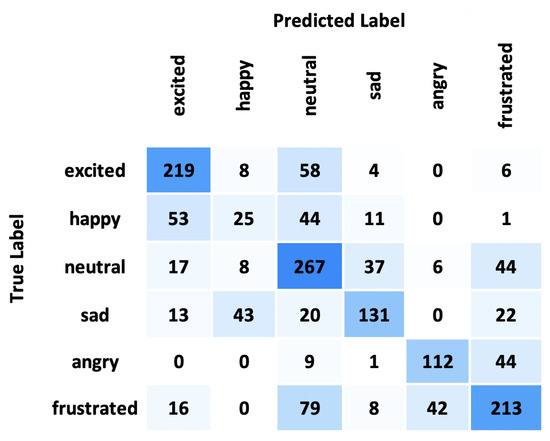 Figure 5 shows the confusion matrix output of the emotion prediction for the 0.75 confidence interval. The confusion matrices provide insights into the performance (exited—74.2%, happy—18.7%, neutral—70.4%, sad—57.2%, angry—67.5%, and frustrated—59.5%) of our audio feature pipeline in emotion detection. They reveal that misclassification often occurs between similar emotion categories. For instance, frustrated emotions are sometimes misinterpreted as angry due to their close resemblance in nature. Moreover, happy emotions may be misclassified into other emotions, possibly because the dataset lacks high-confidence happy emotion labels, as shown in Table 1. Additionally, other emotion categories are frequently misidentified and labelled as neutral. Study [8] shows the performance values of human evaluators on a SER task for five emotions (happy, normal, sad, angry, and afraid) with accuracy scores of happy—61.4%, normal—66.3%, sad—68.3%, angry—72.2%, and afraid—49.5%, which are also similar to our model’s values (apart from the happy emotion), even with six categories.