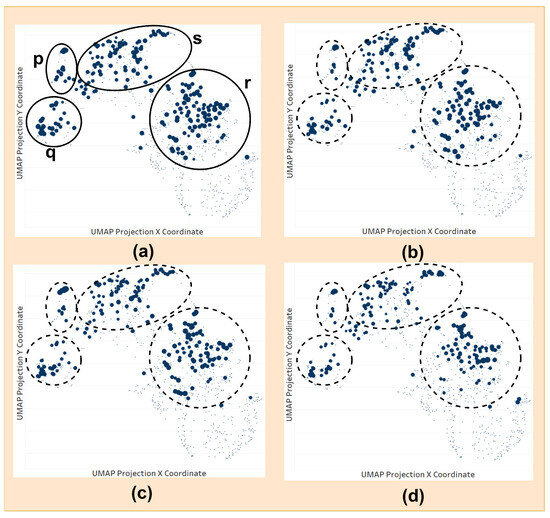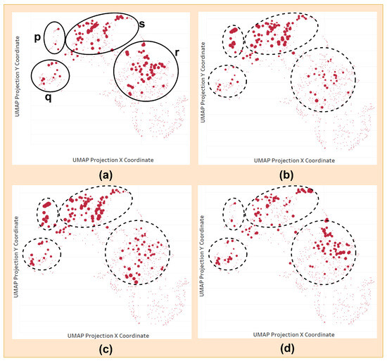 Happy emotion’s 50th percentile values of the first codebook LLD vector’s UMAP projection for different speakers: (a) session 2 male speaker, (b) session 3 male speaker, (c) session 4 female speaker, (d) session 5 male speaker.