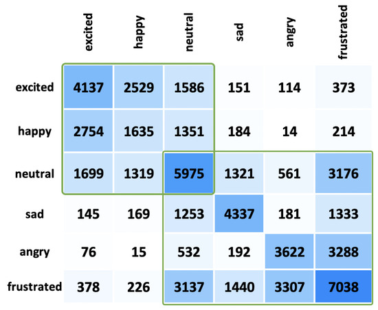 The target emotion of an audio segment in the dataset is determined considering the labels given by the majority of the annotators who are observing the conversation. However, this could be inaccurate, as a person can misinterpret the emotion of someone else, and it is subjective as well. For example, anger and frustration can be seen as overlapping emotions on certain occasions: 55.77% segments labelled as anger had tags as frustration. A speaker could be both angry and frustrated, which led some annotators to label the emotion as angry while others labelled it as frustration. Both are acceptable labels for the audio segment. Therefore, in order to include the audio segments with confused labels, evaluation criteria were adjusted to accept the prediction as successful if even one annotator labelled the audio segment with the predicted emotion, as shown in Equation (7).