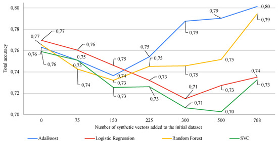 Study of the impact of adding various numbers of synthetic vectors on the classification accuracy of different machine learning algorithms using a GAN-based data augmentation procedure (on the x-axis, zero denotes the classification results based on using the original dataset from [20] (768 vectors) without augmentation. The subsequent numbers denote the quantity of synthetic vectors added to the original dataset). Data augmentation ranged from 10% to 100% of the size of the original dataset.