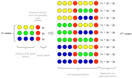 Step 2: Pairwise concatenates all previously expanded vectors from the initial support training dataset formed in the previous step, thereby forming a quadratically increased, augmented support dataset where each vector contains a doubled number of features. The output signal for each such expanded vector is formed as the difference between the outputs of the two corresponding vectors that are concatenated.