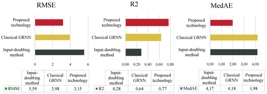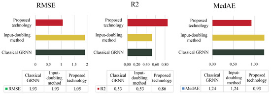 In this case, the results differ somewhat. Specifically, analysis of all investigated performance indicators shows that the use of classical GRNN and the input-doubling method [24] demonstrate similar and unsatisfactory accuracy performance (53% according to the coefficient of determination). It should also be noted that due to this low accuracy, the use of the method from [24] is not appropriate in this case, as it significantly increases the duration of the application procedure due to quadratic augmentation compared to classical GRNN. However, the improved technology presented in this paper achieved a 33% increase in accuracy based on the coefficient of determination compared to [24,29].