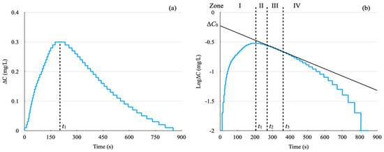 In Zone IV, the variation in oxygen concentration becomes smaller than the detection limit, causing the graph to deviate from a linear trend. This zone occurs when the dissolved oxygen level is within the range of log10ΔC ≤ −0.9~1.5. This value aligns closely with the measurement error of the dissolved oxygen sensor, which may vary slightly depending on specific conditions. After the sample dissolution is complete at t2, we can extrapolate the straight line from Zone III back to t = 0 using Equation (5) to determine ΔC0. This approach is known as the DO method with DE correction.