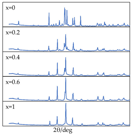 In Figure 6 and Figure 7, we juxtaposed the XRD patterns for x = 0 and x = 1 against the corresponding single-phase JCPDS standards.