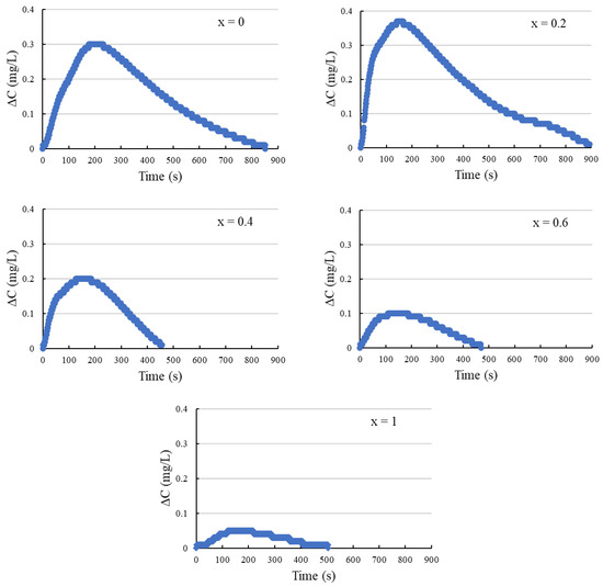 Figure 8 illustrates the temporal variation of dissolved oxygen (DO) concentration, denoted as ΔC (mg/L), in hydrochloric acid. A consistent sample weight of 50 mg of Bi2Sr2−xLaxCuOy is used throughout the experiments. The dissolution process employs 100 mL of 1 mol/L aqueous HCl solution. Upon the introduction of Bi2Sr2−xLaxCuOy into the solution at time zero (t = 0), a notable increase in DO content is observed. The elevation in DO concentration is attributed to the oxygen release delineated in Equation (1). Over time, the dissolved oxygen gradually diffuses into the atmosphere, leading to a decrease in the solution’s oxygen concentration.