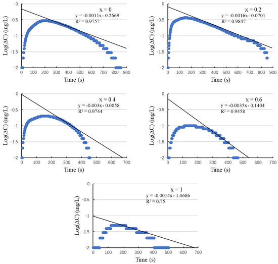 As outlined in Section 2.2, Section 2.3, Section 2.4 and Section 2.5, the linear segment of the graph—indicative of a stable degassing rate—occurs once the Bi2Sr2−xLaxCuOy sample is completely fully dissolved, specifically from t = 200 to 350 s, until log10ΔC reaches approximates −0.5. For instance, the x = 0 sample achieves a logarithmically consistent degassing rate between 176 s (complete dissolution) and 232 s (log10ΔC = −0.5). The coefficient of determination for the least squares analysis of this portion of the graph is greater than 0.9757, indicating an excellent level of linearity. The data in Figure 9 allows for precise identification of the linear portion across various samples.