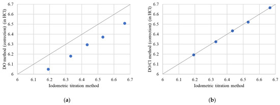 Oxygen content measured by (a) DO method with DE correction and (b) DO/Cl method with DE correction vs. the Iodometric titration method.