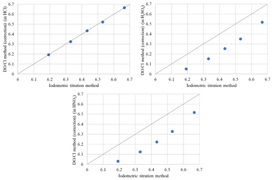 Oxygen content measured by the DO/Cl method with DE correction (in HCl, H2SO4, HNO3) vs. the Iodometric titration method.