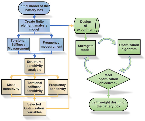 Figure 1 illustrates the overall workflow of the present study. For the first part, the 3D model of the battery box was created using Catia. On this basis, the finite element model of the battery box was developed using Abaqus. Subsequently, the torsional stiffness and frequency of the initial model were evaluated.