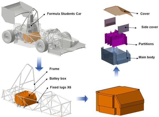 The 3D model of the battery box comprises four components: cover, side cover, partitions, and main body. It is attached to the vehicle’s frame via eight lugs. The dimensional details, design parameters of the battery box model, and mounting locations are presented in Table 2 and Figure 2.