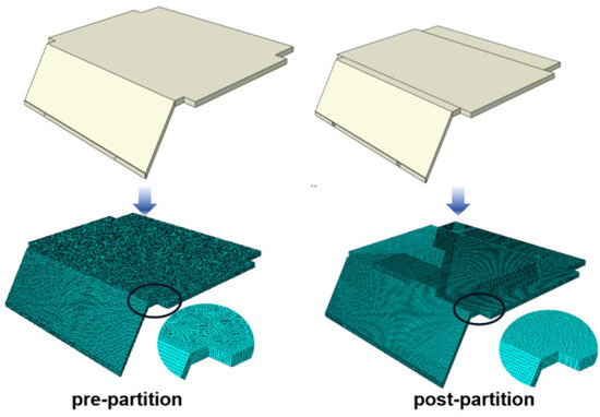 Based on the original design of the battery box model, the initial thickness of each battery box panel was set to 3 mm. Shell elements with an edge length of 4 mm were utilised for meshing in Abaqus. Before partitioning the mesh, it is necessary to create rectangular surfaces from the ones with polygons to improve mesh quality. It should be noted that the surface partitioning process should be performed before establishing the connection relationships to avoid any interference with the connections and prevent them from being invalidated. Figure 3 presents a comparison of the mesh division. The final finite element analysis model consists of 91,209 mesh elements.