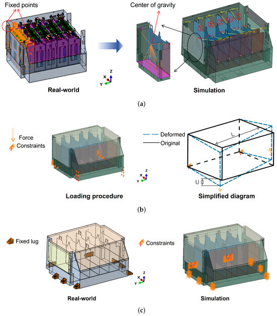 Battery box loading procedure. (a) The centre of gravity and the connection relationship, (b) diagram of the torsional load on the battery box, (c) battery box loading procedure for frequency measurement.
