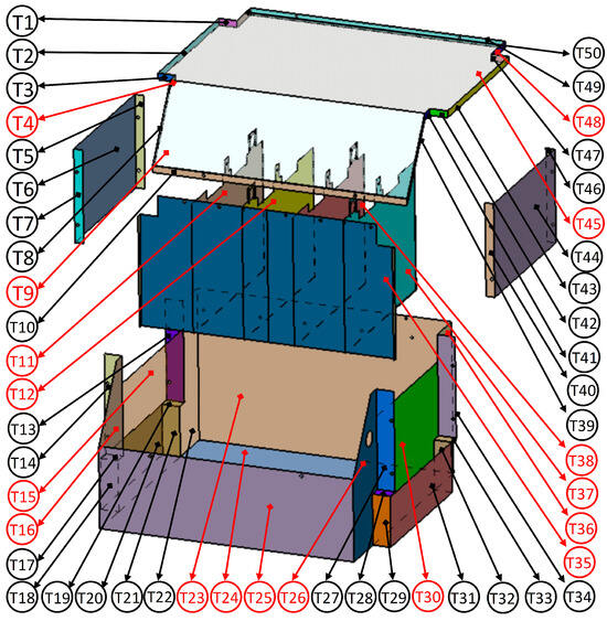 The second principle is that torsional stiffness sensitivity should be less than 0, and frequency sensitivity should be less than 60. The selection of 60 as a threshold for frequency sensitivity is based on data analysis showing that the 0–60 range contains a dense concentration of data points. Panels with a frequency sensitivity greater than 60 have an average frequency sensitivity greater than 600, indicating significant influence. Optimising these panels can increase the battery box’s torsional stiffness while ensuring a controlled frequency reduction. Based on the above selection principles, a total of 17 panels have been chosen as the subsequent optimisation variables (highlighted in red in Figure 6).