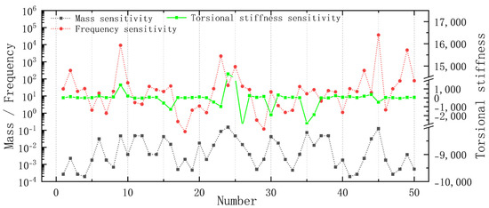The first principle is that the mass sensitivity should be greater than 4.8%. The rationale for this principle is that selected panels with high mass sensitivity cannot be ignored during optimisation; otherwise, significant lightweighting effects would be hindered. The selection of 4.8% as the lower threshold for mass sensitivity is grounded in rigorous data analysis and optimisation strategies. To adhere to the first principle and identify approximately half of the panels (totalling 50), an initial screening revealed a sensitivity range starting at 4.95%. However, closer examination highlighted a concentrated distribution of data points within the 4.8% to 4.95% mass sensitivity interval, suggesting these panels possess greater potential impact and influence on lightweight design efforts. Therefore, 4.8% was established as a prudent lower limit for mass sensitivity to ensure the optimisation process effectively leverages panels with higher sensitivity.