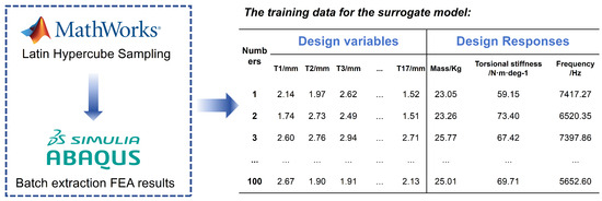 Different sampling methods can impact the fitting accuracy of surrogate models [2,31,32]. It has been proven that the Optimal Latin Hypercube Sampling (OLHS) method has significant advantages in fully exploring the design space [33]. Optimal Latin Hypercube Sampling (OLHS) is a sampling technique that stratifies the entire design space prior to sampling. As a result, it has advantages in achieving uniform sampling in multidimensional space. Therefore, the OLHS method was selected for sampling in the present study. In the present study, the total sample consisted of the thicknesses of 17 panels, with each panel’s thickness ranging from 1.5 mm to 3 mm. In order to save costs and ensure the manufacturing accuracy of the raw material for the battery box panels, the panel thickness accuracy was determined to be 0.01 mm. Therefore, the sampling interval was set at 0.01 mm. The number of sampling points was set to 100. After completing the sampling process, Abaqus was utilised to calculate the response values (battery box weight, torsional stiffness, and the first natural frequency from the constrained modal analysis) for the 100 samples. The above process is depicted in Figure 8.