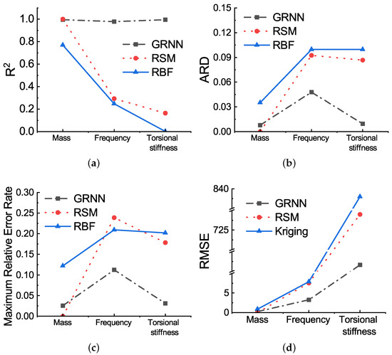 Comparative results of the three surrogate models. (a) Coefficient of determination (), (b) Average Relative Deviation (ARD), (c) Maximum Relative Error Rate, (d) Root Mean Squared Error (RMSE).
