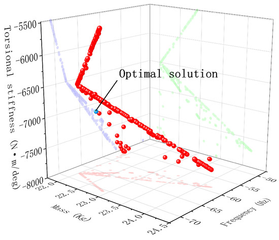 In MOOP, the objectives often exhibit conflicting or competing natures, leading to no single design point being superior in all the optimisation objectives. Therefore, the optimisation result consists of a set of solutions rather than a single optimal solution, known as the Pareto solution. Based on the results obtained from NSGA-II, the Pareto solutions are shown in Figure 10. According to Equation (13), within this Pareto solution, the solution with the lowest mass while meeting specific ranges for torsional stiffness and natural frequency was selected as the final optimisation result for this study. This selected point is also marked in Figure 10. Torsional stiffness and frequency are shown in the graphs as the negative of the actual values to accommodate the optimisation results.