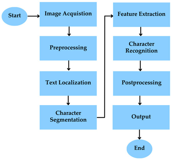 OCR is a technological solution utilized to transform scanned documents and printed or handwritten text from images or other visual sources into text machines can read [37]. OCR technology has become an indispensable tool in numerous industries and applications, including document digitization, data extraction, and text recognition. As illustrated in Figure 1, OCR image-to-text conversion requires the following steps: image acquisition, image preprocessing, text localization, character segmentation, feature extraction, character recognition, and postprocessing.