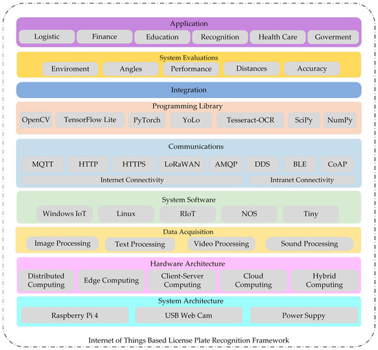 Each layer within the proposed IoT-based LPR framework is a modular interface, thus improving compatibility among components and technologies. The software layer of the framework is crucial, as it establishes standardized communication protocols compatible with various application interfaces and hardware devices. The framework enables easy configuration during implementation. The proposed architecture enables precise fine-tuning and calibrations at every level, thus improving the ability to meet security requirements and optimizing real-time LPR capabilities. The system architecture incorporates a variety of hardware models and seamlessly integrates state-of-the-art USB web cameras to ensure dependable data processing. The design is essential for effectively implementing LPR technologies, thus guaranteeing that the system can adapt to changing image recognition capabilities and demonstrating the interconnectedness of each vital component in terms of scalability and long-term viability of LPR systems.
