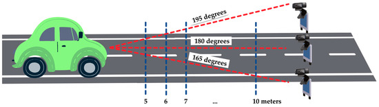 The research methodology is devised to systematically evaluate the influence of camera angle, object velocity, and distance on the efficacy of license plate detection using the Raspberry Pi 4 platform set up with a camera module that can capture images specifically for license plate detection. With the aim of achieving our research objectives, this study rigorously tests a variety of camera angles (135°, 150°, 165°, 180°, 195°, 210°, 225°), object speeds (<5 km/h, <10 km/h, <15 km/h), and distances (5–10 m) using a Raspberry Pi 4 platform. Each configuration is tested 100 times to ensure statistical reliability. The methodology is specifically designed to evaluate the significant impact of these variables on LPR system accuracy and reliability, thus providing crucial insights for the field of computer vision and image processing. Additionally, the distances between the camera and the objects are modified to replicate diverse operational situations, as depicted in Figure 4.