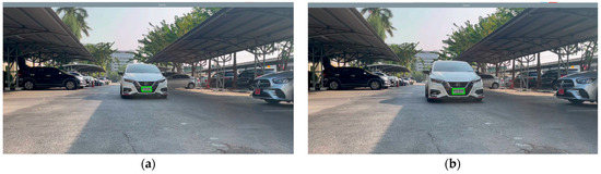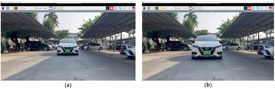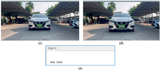 The sampling results thoroughly assess the LPR system implemented on Raspberry Pi 4 through practical experimentation, as shown in Figure 5a–d. The data illustrate the results obtained by capturing images from different perspectives and distances using the LPR system in real-world scenarios. Figure 5a–d depict images obtained at distances ranging from 10 m to 5 m. The camera was positioned at a fixed angle of 180 degrees. These images provide a visual depiction of the recorded license plates at different distances, thus enabling an evaluation of the system’s ability to recognize characters at varying proximities accurately. Additionally, Figure 5e demonstrates the outcome of the LPR for OCR procedure on a Thai license plate. It showcases the system’s ability to accurately extract and recognize characters from the captured license plates.