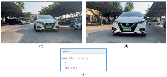 The performance of the LPR system on Raspberry Pi 4 was thoroughly evaluated based on the data obtained from practical experiments, as illustrated in Figure 6a–c. The experiments involved capturing images at a fixed angle of 165 degrees and at different distances from the target license plate. The images in Figure 6a–c depict license plates captured at varying proximities of 10 m, 8 m, and 5 m. These visual representations illustrate the license plates at different distances. Furthermore, an image captured at a precise angle of 195 degrees from a distance of 5 m is displayed in Figure 6d. This image offers valuable insights into the system’s ability to withstand variations in camera angle. The outcome of the LPR for OCR procedure is depicted in Figure 6e, which demonstrates that the system successfully extracted and identified characters from the captured license plates with precision.