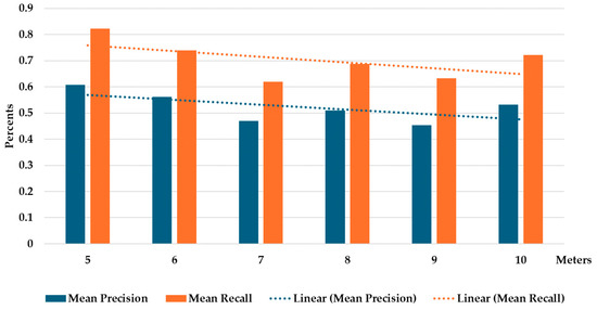 The mean precision and recall of the real-time LPR system at different distances, implemented on an SBC, are effectively depicted in Figure 8. The mean recall for each distance is represented by the orange bars, whereas the mean precision is denoted by the blue bars. Dot trend lines underscore trends in overall performance. The chart illustrates a noteworthy discovery: the optimal performance is observed at 5 m, with corresponding mean precision and recall values of around 0.607 and 0.823. This finding indicates that the SBC-based system successfully manages the trade-off between accurate license plate identification and comprehensive detection at the ideal distance. This finding is critical to optimizing the system.