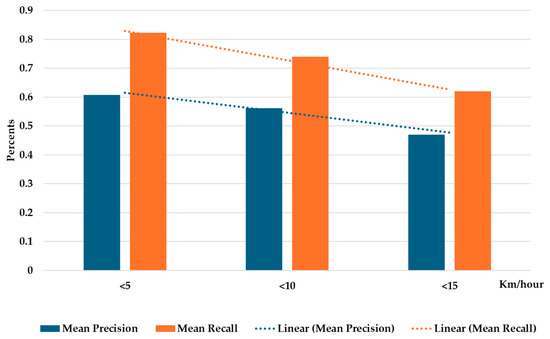 The mean precision and recall of the real-time LPR system operating at various speeds on an SBC, such as Raspberry Pi, are illustrated in Figure 9. The mean precision is denoted by the blue bars, whereas the mean recall for each speed category (<5 km/h, <10 km/h, <15 km/h) is represented by the orange bars. The dotted trend lines depict overarching patterns in precision and recall with the progression of vehicle speed. The system attains its highest mean precision and recall values, approximately 0.607 and 0.823, respectively, at speeds below 5 km/h. This indicates that the SBC-based system is most effective at balancing comprehensive detection with accurate license plate identification at lower speeds.
