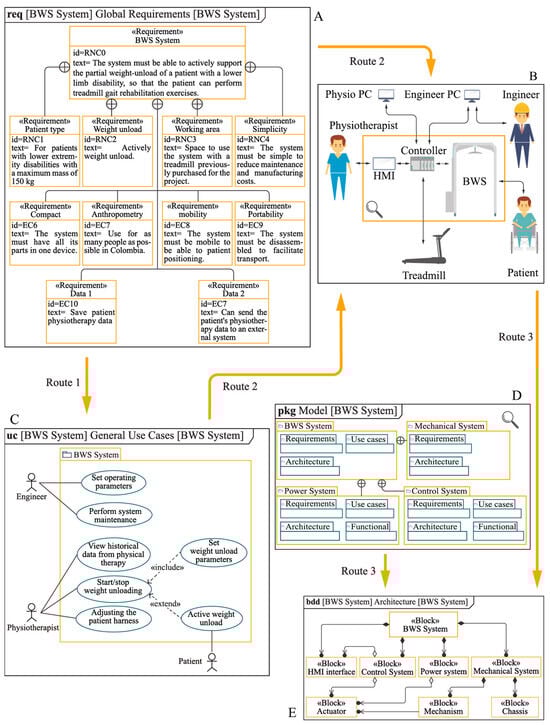 Flux diagram of the global development of the BWS in SysML form. (A) General requirements diagram. (B) System layout diagram. (C) Use Case Diagram. (D) Pack diagram. (E) General structure of the system.