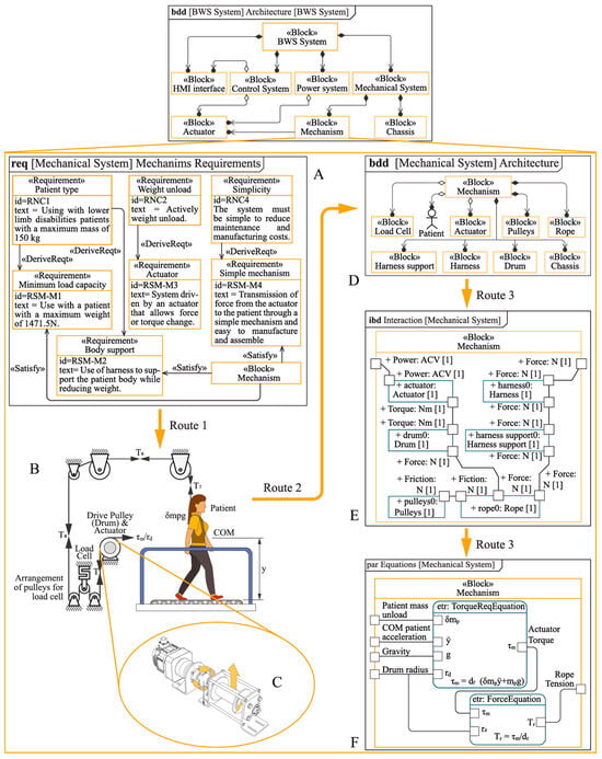 Flux diagram of the BWS mechanism development in SysML form. (A) Mechanism requirements diagram. (B) Mechanism layout diagram. (C) Mechanism transmission system. (D) Mechanism architecture. (E) Internal block diagram of the mechanism. (F) Mechanism parameters.