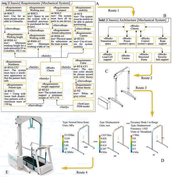 Flux diagram of the BWS chassis development in SysML form. (A) Chassis requirements diagram. (B) Chassis layout diagram. (C) Chassis CAD model. (D) Proof cases for the chassis. (E) Final model of the chassis.