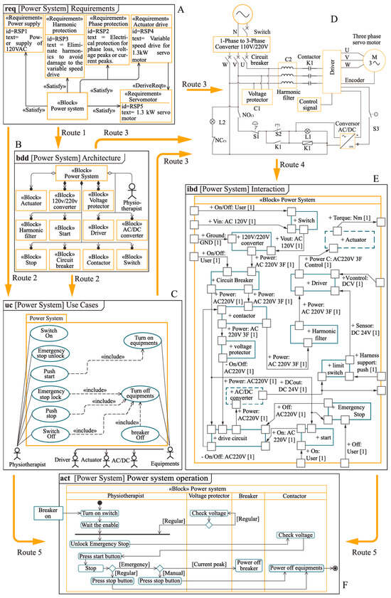 Flux diagram of the BWS power system development in SysML form. (A) Power system requirements diagram. (B) Power system layout diagram. (C) Power system use cases. (D) BWS power system circuit. (E) Power system internal block diagram. (F) Power system sequence diagram.