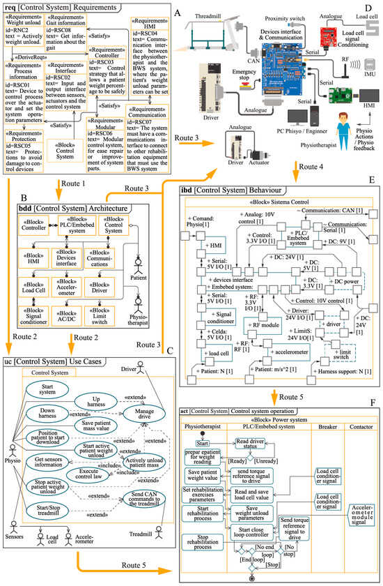 Flux diagram of the BWS control system development in SysML form. (A) Control system requirements diagram. (B) Control system layout diagram. (C) Control system use cases. (D) Control system configuration. (E) Control system internal block diagram. (F) Control system sequence diagram.