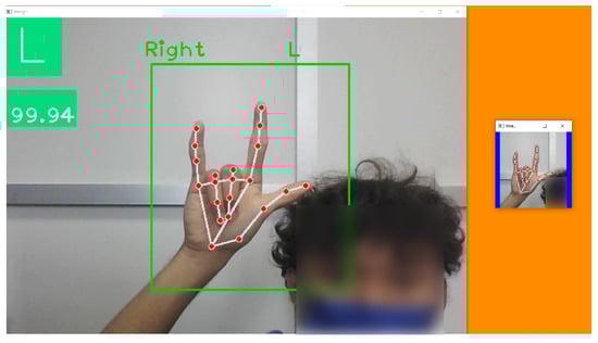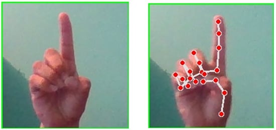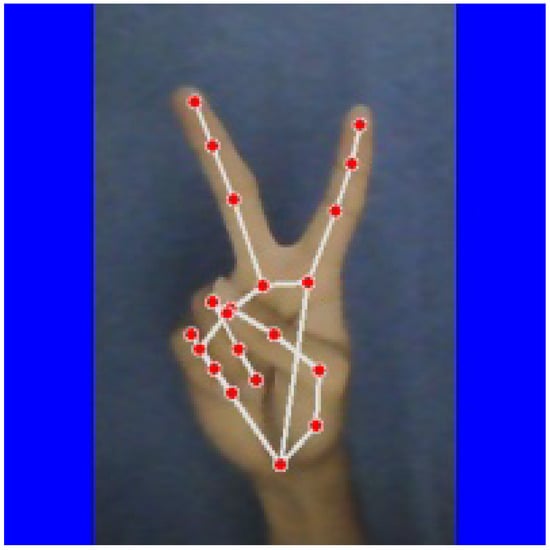 This database was modified to the images containing the structural marks created by MediaPipe. However, the other two still needed to be fulfilled. With these data, a CNN model was compared with a similar one trained with our database. This external database is comprised of 4347 images of 200 × 200 pixels with three color channels; there are exactly 207 images for each of the 21 signs. In Figure 4, you can see an image of this base after being processed with MediaPipe.