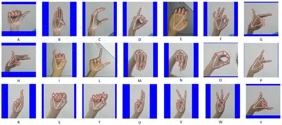 A hand detection algorithm based on MediaPipe and OpenCV functionalities was created to ensure the photographs met the above conditions. This algorithm extracted photographs that met the conditions described above from video frames from a webcam. Thanks to MediaPipe, this algorithm framed the area occupied by the hand in the image and identified its structural parts, which were schematized by points and lines drawn on the image. In addition, it had the task of identifying if the detected hand was right or left and reflecting it as required. The size of the photographs obtained was 200 × 200 pixels, one color and with a blue frame generated by the algorithm to reduce the presence of background elements in the final image. The set of images used in this study was formed only with photographs of the hands of an individual. Figure 3 shows examples of photographs obtained at this stage of all the letters.