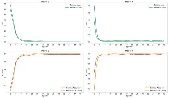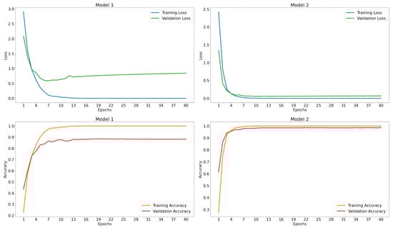 The comparison between Models 1 and 2 shows that the accuracy achieved by Model 1, 88.16%, on its validation set is considerably lower than that achieved by Model 2, which was 98.56%. The same behavior occurs with their losses on the validation set, with Model 1 having a higher loss than Model 2.
