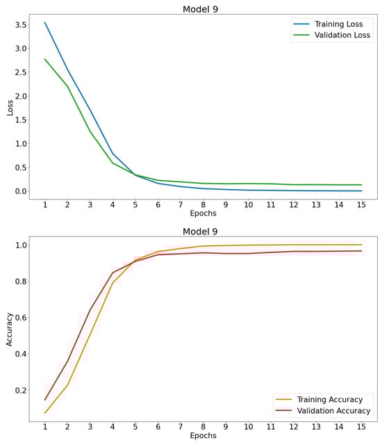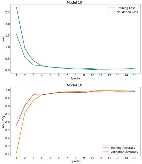 Table 4 summarizes the main characteristics of the first trained models, presenting values related to the training process and referring to the training and validation samples. The training and validation values of loss and accuracy presented in Table 4 correspond to those obtained in the last epoch of the training process.