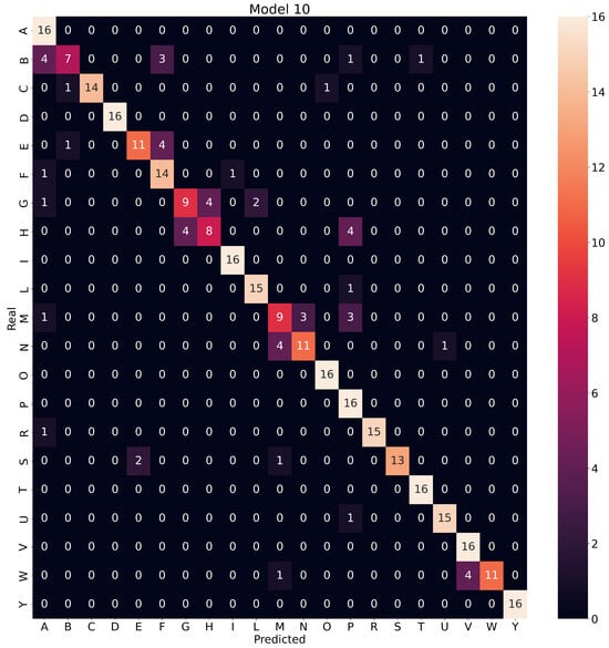 The average, per letter, of precision, sensitivity, and specificity obtained by the final model were, respectively, 84.57% with a standard deviation of 14.55%, 83.33% with a standard deviation of 19.20%, and 99.17% with a standard deviation of 0.92%. The letters best classified by the final model were D and Y, with a precision and sensitivity of 100% during testing. The worst classified letters were N, M, B, G, and H. In the case of the last letters, the model confused them. It is believed that due to multiple convolutions, the model found it challenging to distinguish between the case when only the index finger was extended and the case when the middle finger accompanied it, as convolutions contributed to mixing and condensing the features of these fingers, negatively impacting the classification. Something similar happened with the letters W and V.