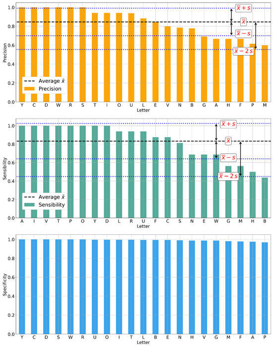 Graphs of the precision, sensitivity, and specificity, by letter, obtained by model 10 on the test data.