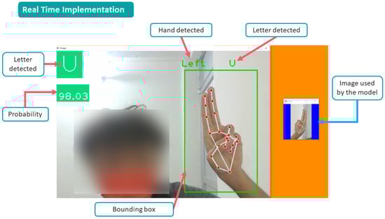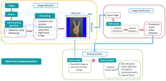 Since real-time classification consisted of implementing the final model together with the hand detection algorithm, its operation was conditioned to the operation of both. The fluency in implementing the final system was achieved by avoiding previous filters on the input images and keeping the final CNN model with few parameters (363, 365), compared to the other models obtained in this study. With this, it was possible to make the implementation computationally accessible for devices with limited resources, such as a Raspberry Pi 4 or laptops without a GPU and few processing cores.