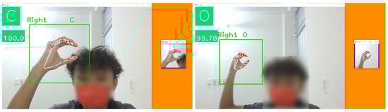 The final system consisted of real-time implementation of the final model, the hand detection algorithm, and some OpenCV functionalities. Figure 10 shows the functioning of the final system and Figure 11 shows the system in operation.