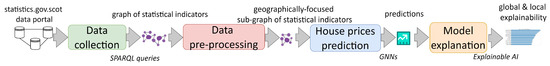 At the same time, linked data technologies have been used to facilitate the integration of open statistical data on the web. Linked statistical data are highly structured data describing statistical indicators based on a set of dimensions, including a geographical dimension and temporal dimension, and attributes [17]. As a result, linked statistical data formulate open statistics Knowledge Graphs (KGs). The structure of open statistics KGs, which already captures spatial relationships between geographical dimensions, makes them suitable for creating GNNs. Currently, open statistics KGs can be accessed as linked data by many official government data portals (e.g., the official portal for European data https://data.europa.eu/, accessed on 30 March 2024) allowing for their integration and the creation of valuable applications for governments, policy makers, enterprises, and citizens. For example, linked statistical data have been previously used to help house owners, buyers, and investors understand which factors affect and determine the prices of houses in the Scottish data zones [18].