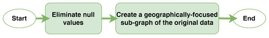 (2) Pre-process data (Figure 3). This step transforms the integrated statistical indicators into a geo-centric knowledge graph that is suitable for being used by Graph Neural Network (GNN) algorithms to predict the house prices in Scottish “2011 data zones”. Toward this end, data zone records with null values in every feature are initially removed. The remaining data are then formatted in a way that is centered on the “2011 data zones”. To achieve this, a geographically focused sub-graph of the original linked dataset was created. The Scottish “2011 data zone” are the central nodes of the sub-graph, each of them connected to the values of the associated features. An illustration of this transformation is shown in Figure 4. More details are presented in Section 4.2.