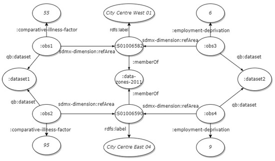 In Figure 4, an example of the initially retrieved graph with the Scottish statistical data is presented. The graph comprises four observations derived from two datasets (two observations per dataset). All observations pertain to 2015. The observations of dataset 1 describe “Comparative Illness Factor” (CIF), which is an indicator of health conditions, for two data zones, namely “City Centre West 01” and “City Centre East 04”. The two data zones are neighboring areas within Aberdeen, a city in North East Scotland and the third most populous city in the country. The value of CIF is 55 and 95 for the “City Centre West 01” and the “City Centre East 04” of Aberdeen, respectively. Similarly, the observations of dataset 2 describe the percentage of employment deprivation in the same data zones, which is 6% in the “City Centre West 01” and 9% in the “City Centre East 04”.