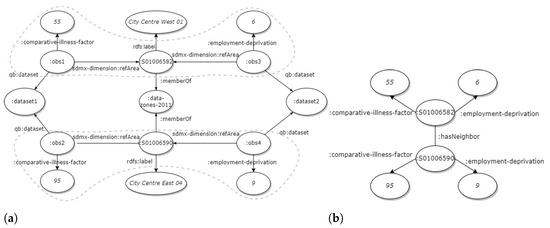 In Figure 5a, the part of the geo-centric graph that will be used for constructing the GNNs is selected. Only nodes with information regarding the “2011 data zones”, the value of the measure of the statistical indicator, and the values of additional properties (e.g., gender, age, etc.) are required. All other information, such as the dataset or the observations, is excluded. The final sub-graph is presented in Figure 5b. The edge connecting the data zone nodes represents the neighboring relationship between the data zones.