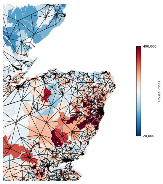 The final graph comprises a total of 6014 interconnected nodes (or data zones), with 20,521 edges representing the adjacency of the respective data zones (Figure 6). Consequently, there is a connection between each data zone and its adjacent data zones. The hue of the data zones signifies the mean house price within its locale, ranging from deep blue to intense red as the mean house price ascends, thereby offering a visual gradient of housing costs.