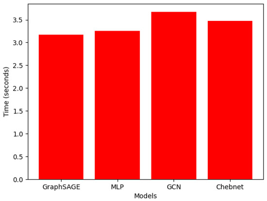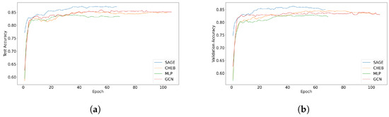 Figure 7 shows the test and validation learning curves of the three GNN variants and MLP. Notably, GraphSAGE exhibited the highest accuracy scores, both in test and validation scenarios, from the very beginning of the training process. This suggests a promising level of learning efficiency and model stability in GraphSAGE. GraphSAGE’s early high accuracy scores can be attributed to its robust learning mechanism, which effectively harnesses the features of the local neighborhood of each node. The capacity to employ sampling to aggregate information from the node’s neighborhood appears to confer an initial advantage to GraphSAGE over the other architectures in the test and validation plots. Moreover, a high initial accuracy suggests that GraphSAGE requires fewer epochs to reach an optimal or near-optimal performance, leading to reduced training times and resource expenditure, while all other models are trained for longer epochs.