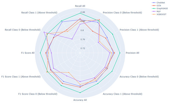 Three GNN variants are implemented, as explained in Section 3, namely, Graph Convolutional Network (GCN), Chebyshev Neural Network (ChebNet), and GraphSAGE. The three GNN variants are compared against an XGBoost model that has been previously tested on the same dataset and against a Multilayer Perceptron (MLP) that acts as a per-node baseline classifier that does not incorporate the underlined graph structure.
