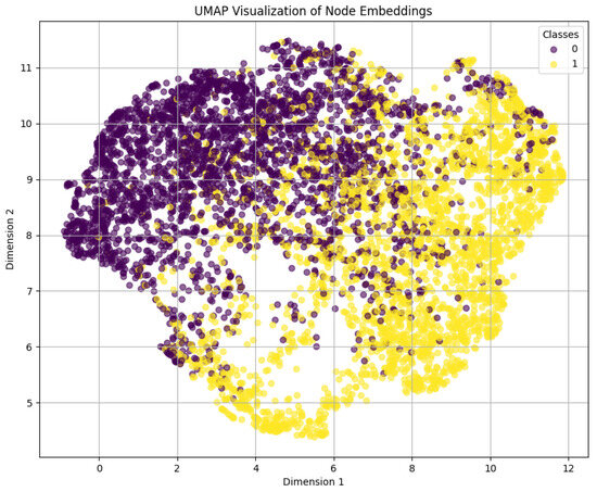 The study utilizes an undirected, attributed graph, wherein each node incorporates a 59-feature vector. This graph comprises 6014 nodes and 20,521 unweighted edges. Prior to the implementation of the experiments, all features are normalized to a 0–1 scale to ensure consistent comparability across various feature ranges. The implementation details of the experiments are the following. All networks consist of two layers followed by a Relu non-linear activation function, and the final layer is used for binary classification followed by a logistic sigmoid activation. The learning rate of all networks is 0.01 and the dimension of hidden units is set to 32, while the dropout rate is 0. Furthermore, the Adam optimization method [132] is selected for all GNN models during training. Early stopping was implemented to mitigate the potential of model overfitting. If no improvement in validation accuracy was observed over 20 consecutive epochs, the training process was terminated. The cross-entropy loss function was adopted to assess the performance of all neural networks.