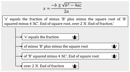 In [24], the authors introduce Math Genie, a hearing equation browser that aims to represent mathematical expressions using a synthesized voice. This solution reads the elements of the expression one at a time, navigating within a hierarchical structure. While Math Genie provides detailed descriptions of mathematical expressions, it lacks hearing cues such as earcons or tones to guide the user through the different elements of the expression. The Web Sonification Sandbox system [28] represents mathematical expressions through graphs. Then, these graphs are mapped to determine different points in two dimensions (x-axis and y-axis), which are used to generate audio. Thus, the higher the point of the axis is, the sounds will be higher or lower (in pitch, not volume). Web Sonification Sandbox’s weakness is represented by not being able to identify the structure of an equation; it only gives sound to its resulting points.
